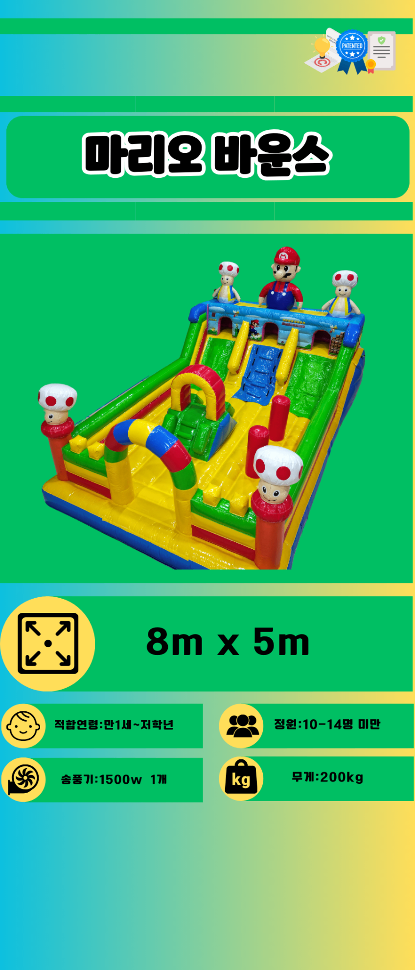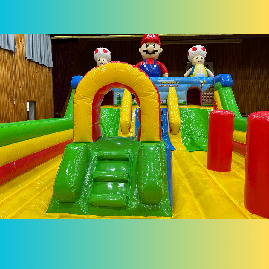 마리오 바운스 (중형)게임 속 마리오 세계를 그대로 옮긴 듯한 중형 에어바운스!알록달록한 디자인과 점프·미끄럼이 어우러져 유치원과 초등학교에 인기 최고!서울·인천·경기·광주 등 전국 어디서든 예스바운스에서 신나게 대여하세요!