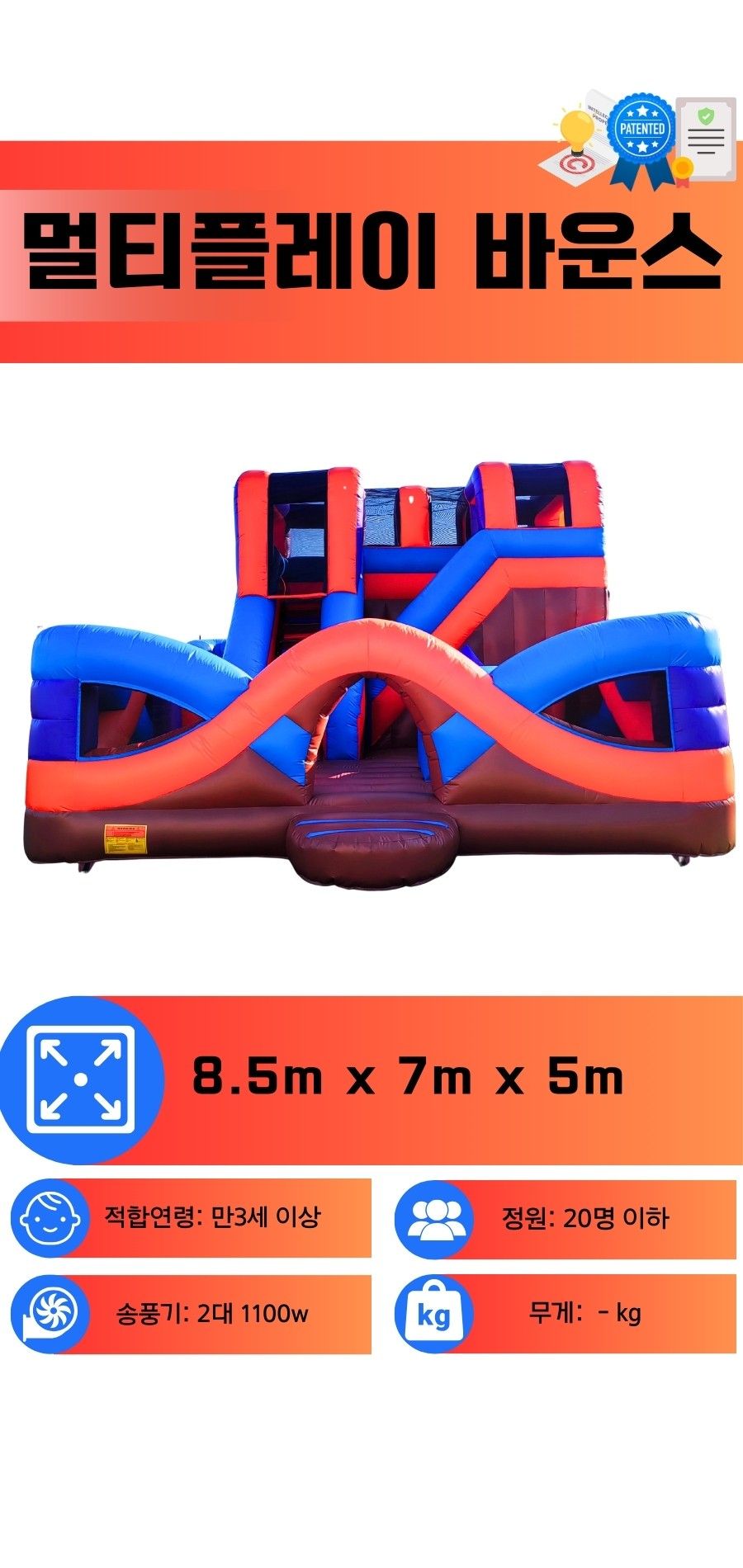 멀티플레이 에어바운스는 넓은 방방이와 입체적인 놀이구조가 결합된 대형 놀이기구입니다. 슬라이드, 점프존, 터널형 구조까지 다양한 놀이요소가 하나에 담긴 멀티플레이 에어바운스는 **초등학교 운동회, 유치원 체육대회, 어린이날 행사, 교회 및 지역축제**에서 아이들의 몰입도를 극대화합니다. 입체적인 구조와 시선을 사로잡는 컬러감, 안전한 설계로 **놀이성과 포토존 효과를 동시에 갖춘 제품**입니다.  **서울, 경기, 인천, 광주, 등 전국 설치 가능**하며, 철저한 소독 및 설치로 행사 당일 최고의 만족도를 보장합니다.