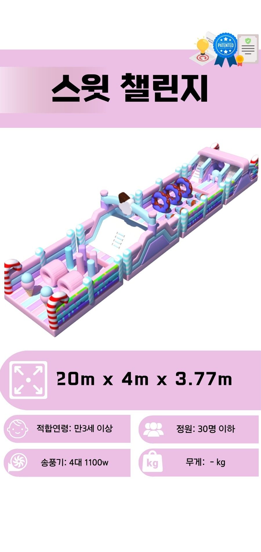 스윗 챌린지 에어바운스는 20m 길이의 코스를 따라 아이들이 달콤한 디저트 월드 속에서 도전하고 모험하는 체험형 에어바운스입니다. 캔디, 초콜릿, 아이스크림 등 달콤한 테마와 점프, 터널, 장애물 코스가 결합된 구조로 **초등학교 운동회, 유치원 체육대회, 어린이날 행사, 교회 축제** 등 다양한 행사에서 아이들의 집중도와 참여도를 높여줍니다. 20m x 4m 크기의 대형 구성으로 시각적인 임팩트가 강하며, **실내 체육관뿐 아니라 야외 운동장에도 설치 가능**해 활용도가 매우 높습니다. 행사 포토존으로도 손색없으며, 놀이와 체험, 몰입형 디자인까지 모두 갖춘 신제품입니다. 예스바운스는 서울, 경기, 인천, 대전, 광주, 대구 등 **전국 어디든 설치 가능**하며, 설치 전후 꼼꼼한 안전 점검과 철저한 소독으로 안심하고 이용하실 수 있습니다.