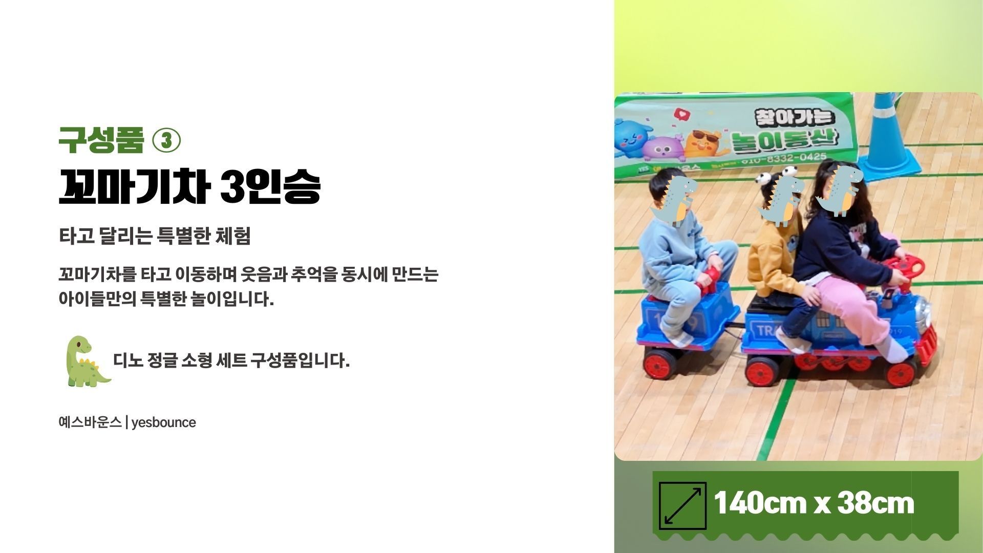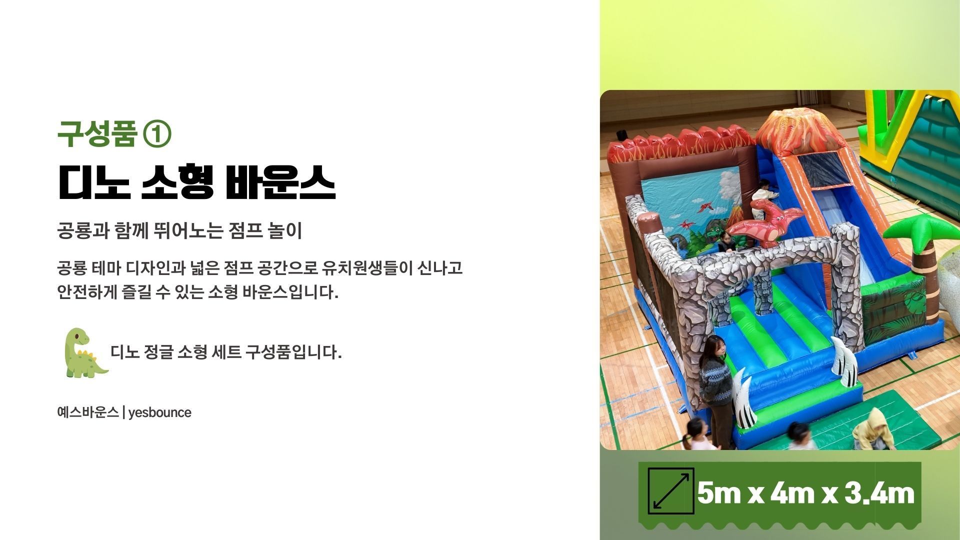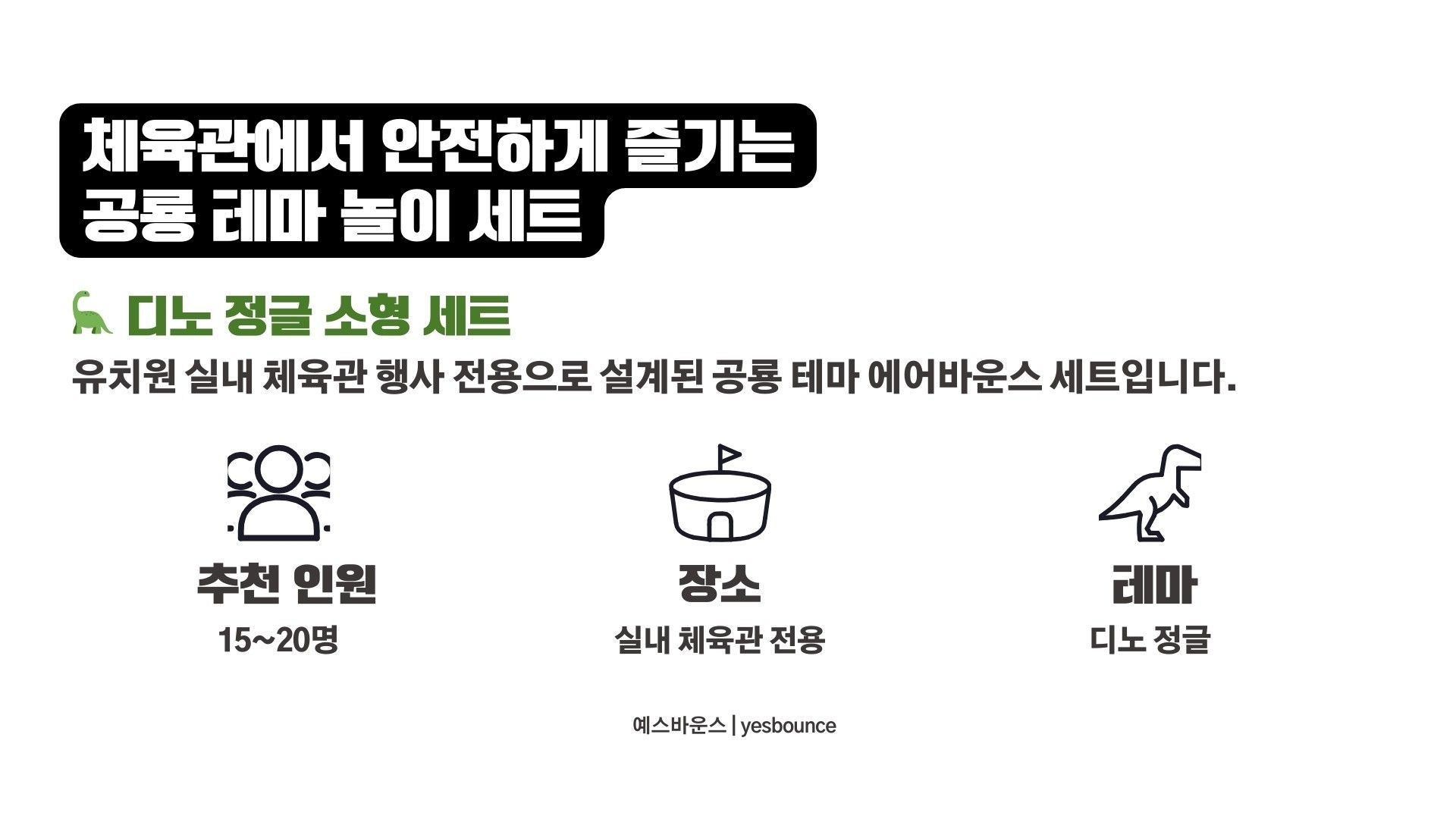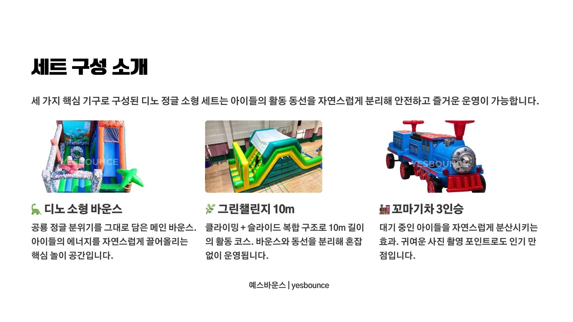 디노 정글 소형 세트는 유치원 체육관 및 실내 행사에 적합한 공룡 테마 에어바운스 세트입니다. 디노 소형 바운스, 그린챌린지 10m, 꼬마기차 3인승으로 구성되어 유치부 체육활동 및 원내 특별 행사에 활용됩니다. 실내 공간에 맞춘 안전한 배치가 가능한 행사 전문 구성입니다.