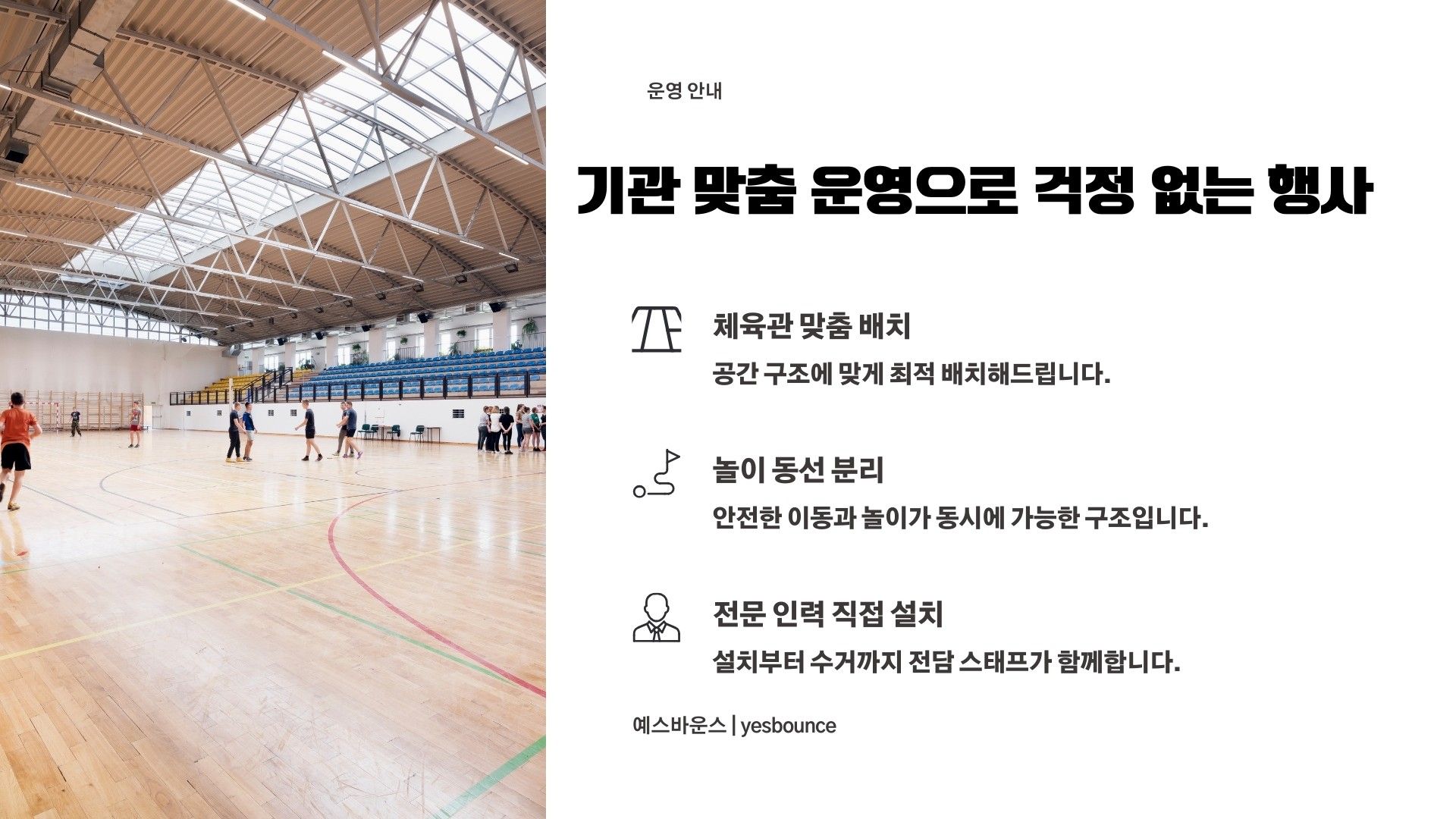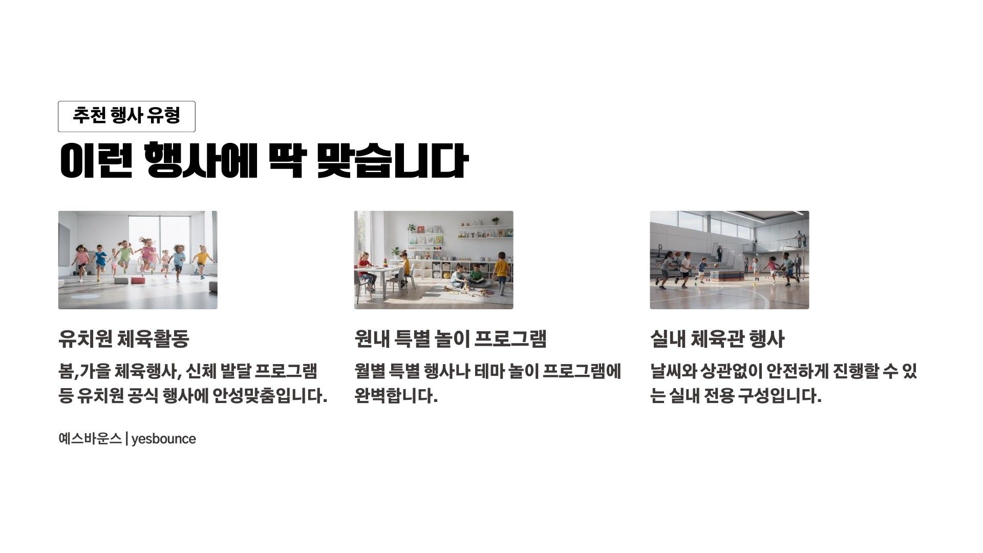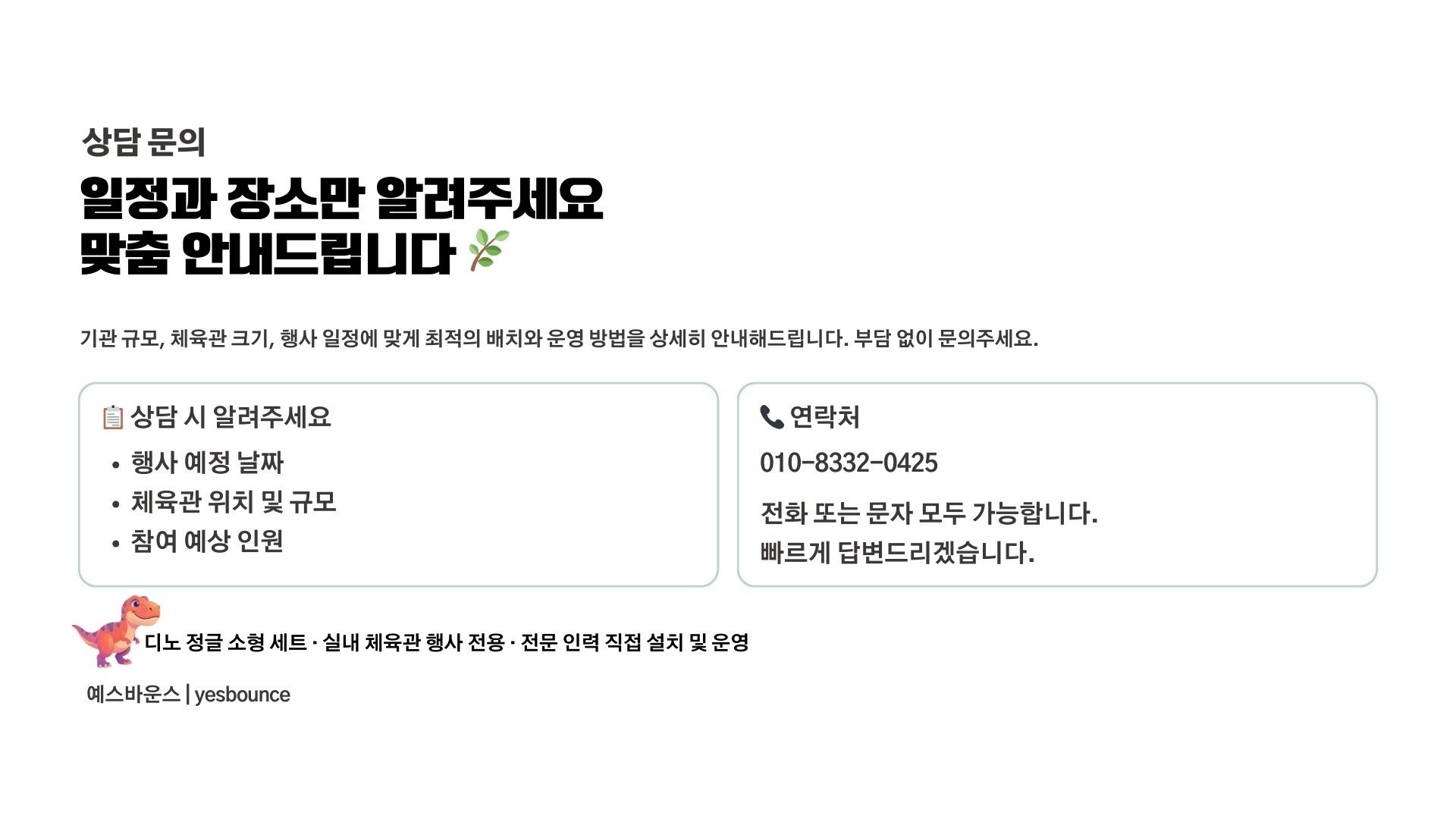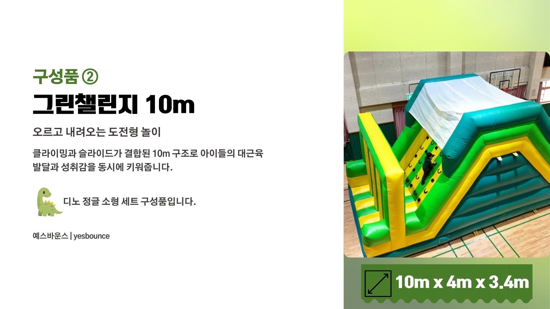 디노 정글 소형 세트는 유치원 체육관 및 실내 행사에 적합한 공룡 테마 에어바운스 세트입니다. 디노 소형 바운스, 그린챌린지 10m, 꼬마기차 3인승으로 구성되어 유치부 체육활동 및 원내 특별 행사에 활용됩니다. 실내 공간에 맞춘 안전한 배치가 가능한 행사 전문 구성입니다.