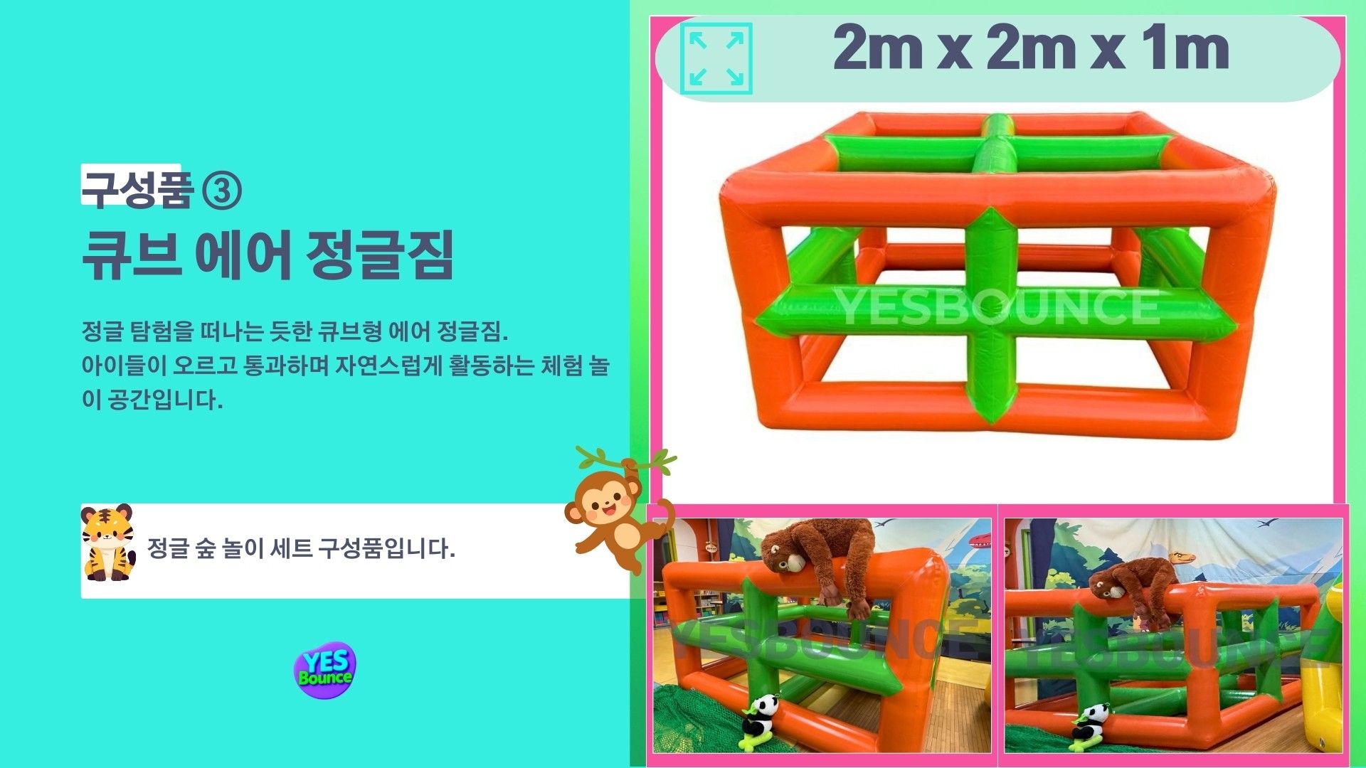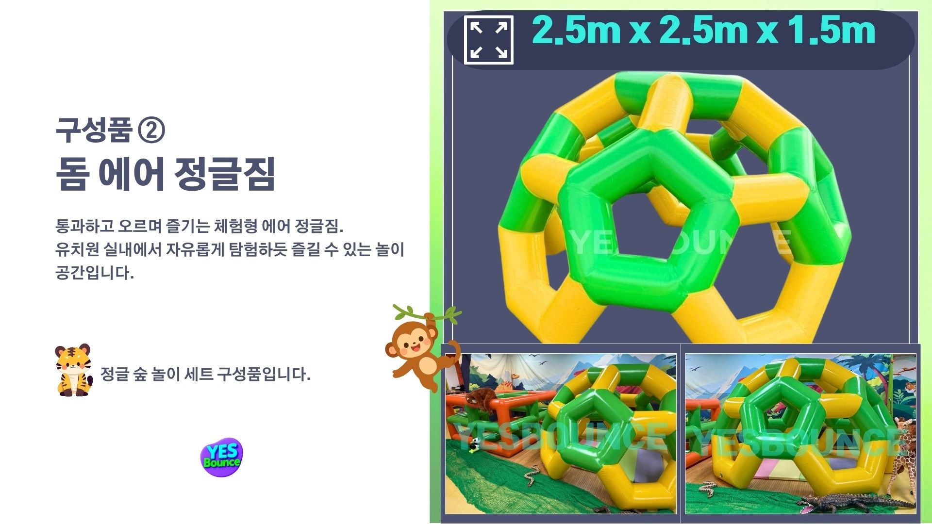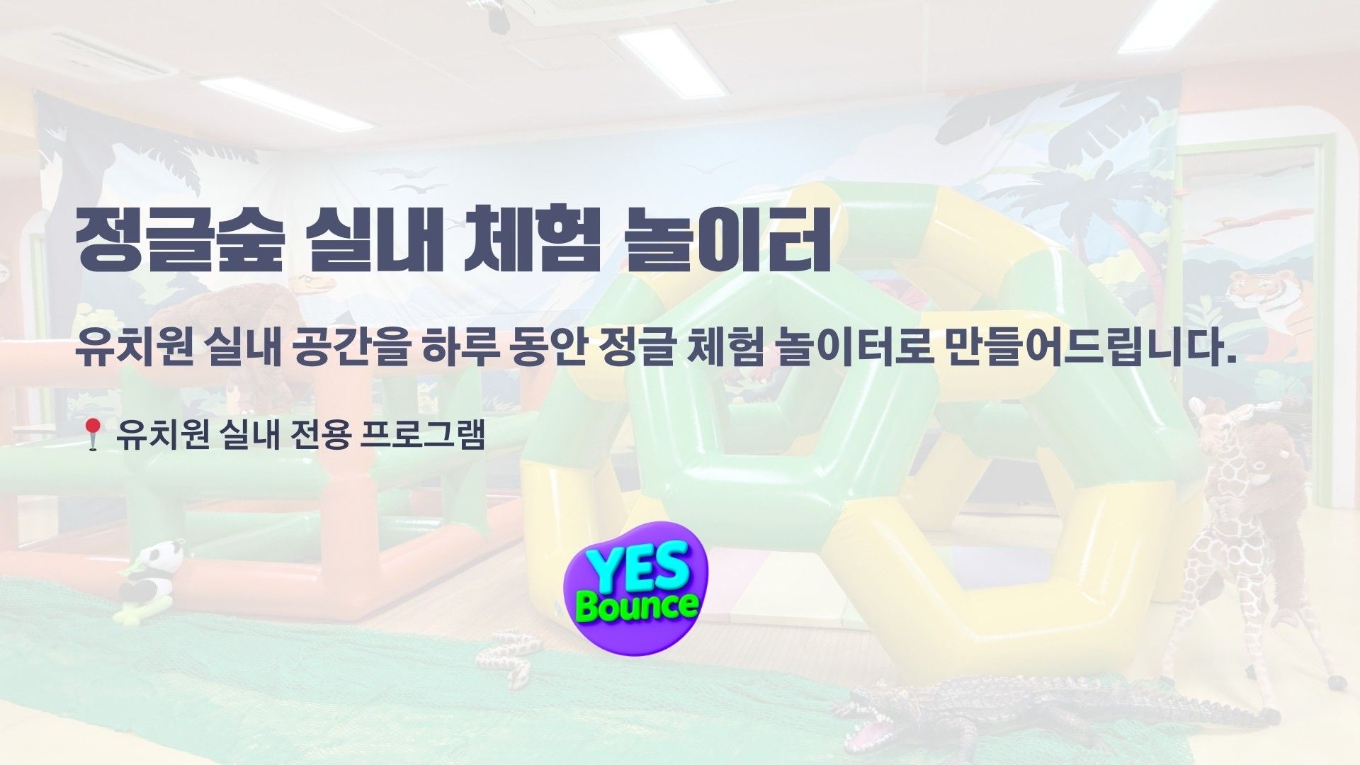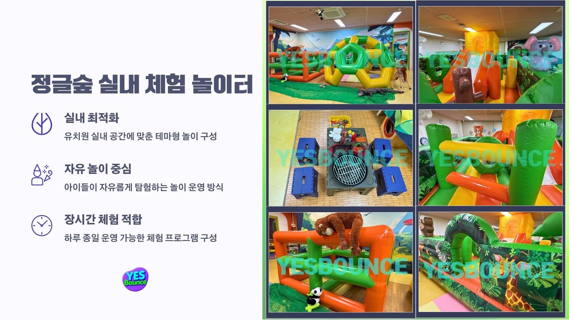 유치원 실내 체험 놀이 프로그램.정글 숲 체험 놀이터는 유치원 실내 공간을 하루 동안 체험형 놀이 공간으로 만들어주는 프로그램입니다. 정글 숲 바운스, 돔 에어 정글짐, 큐브 에어 정글짐, 캠핑 놀이존으로 구성되어 아이들이 자유롭게 탐험하며 다양한 놀이 활동을 즐길 수 있습니다. 유치원 체육활동, 특별 놀이 프로그램, 실내 행사 등에 적합한 체험 놀이 구성입니다.