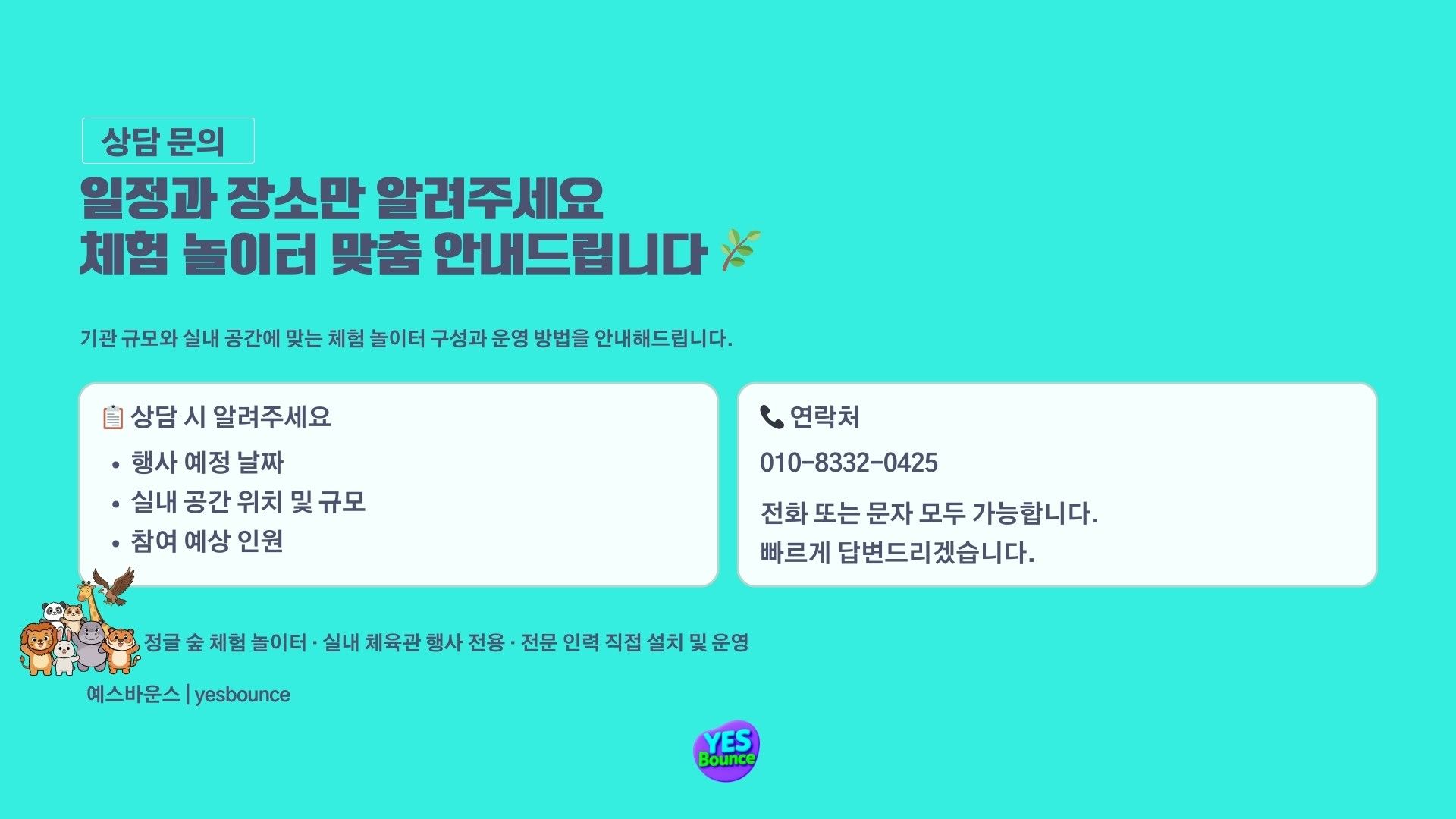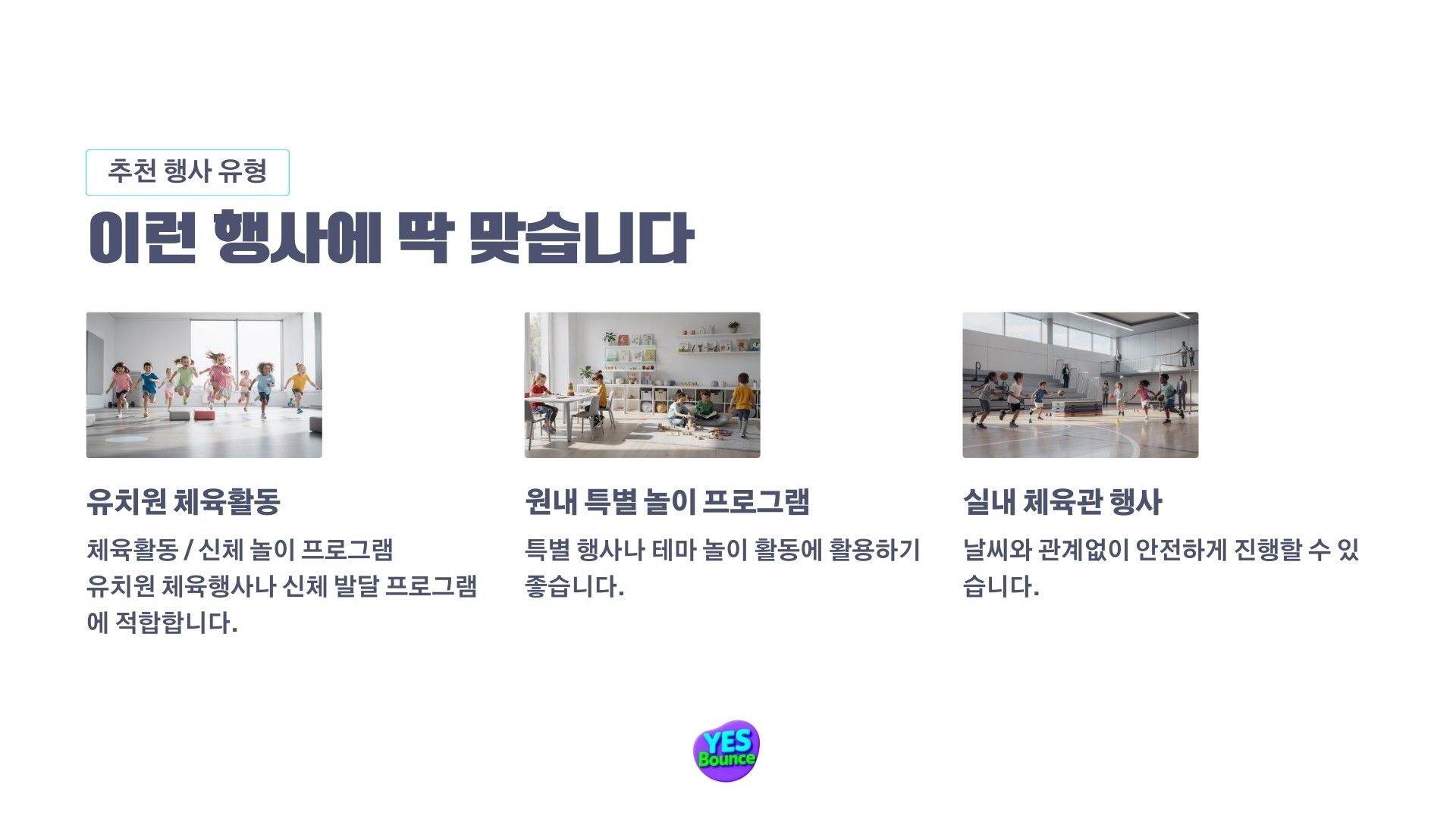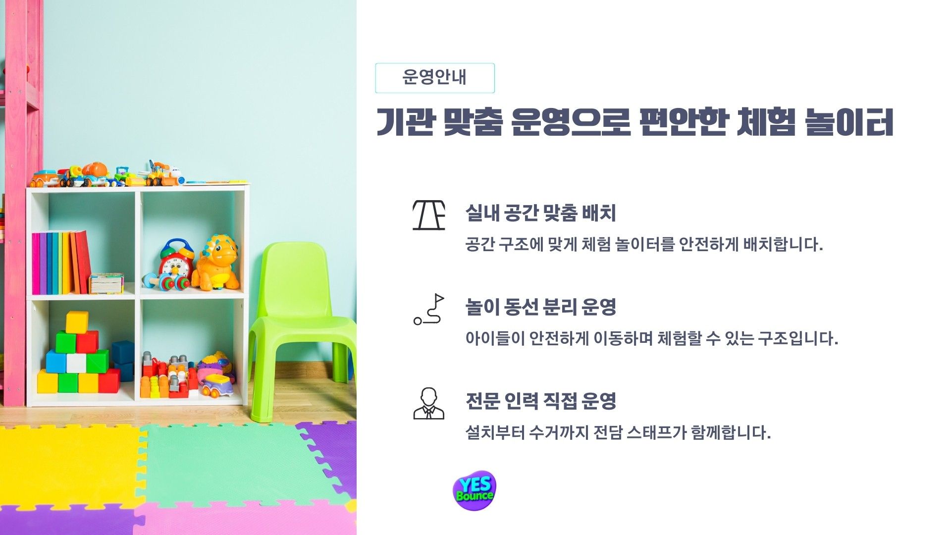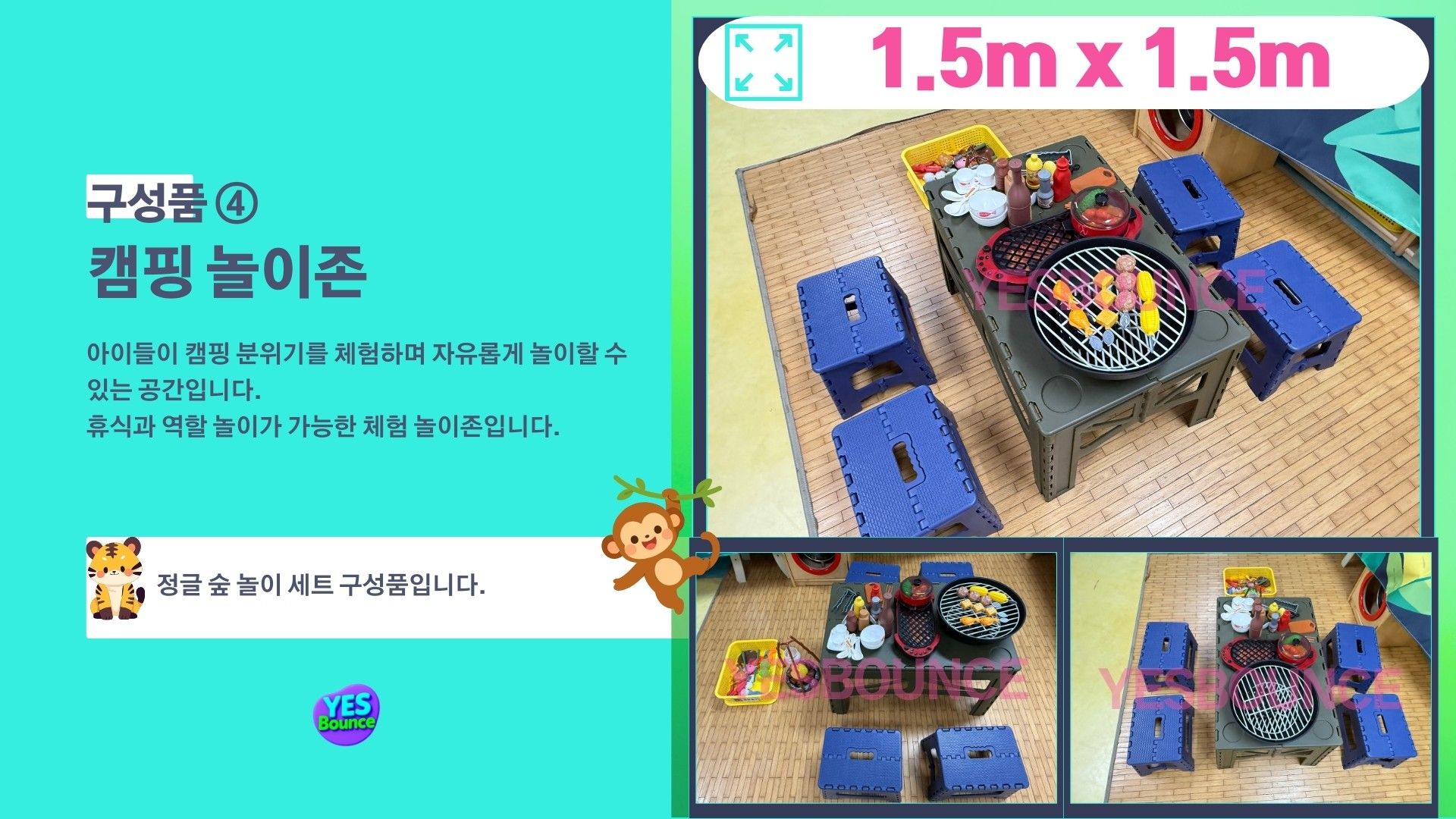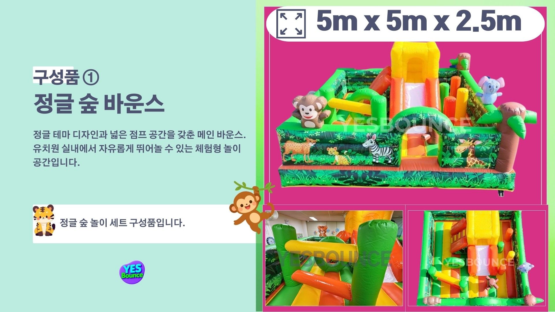 유치원 실내 체험 놀이 프로그램.정글 숲 체험 놀이터는 유치원 실내 공간을 하루 동안 체험형 놀이 공간으로 만들어주는 프로그램입니다. 정글 숲 바운스, 돔 에어 정글짐, 큐브 에어 정글짐, 캠핑 놀이존으로 구성되어 아이들이 자유롭게 탐험하며 다양한 놀이 활동을 즐길 수 있습니다. 유치원 체육활동, 특별 놀이 프로그램, 실내 행사 등에 적합한 체험 놀이 구성입니다.