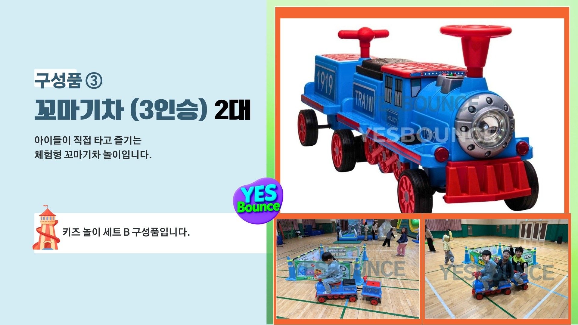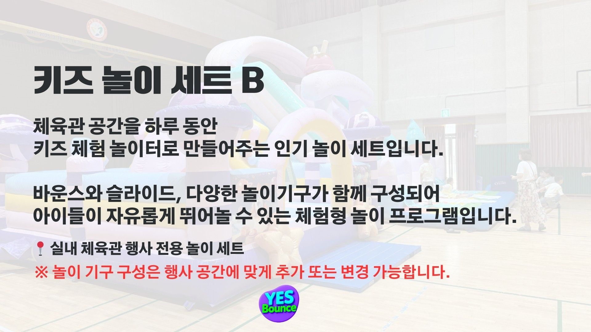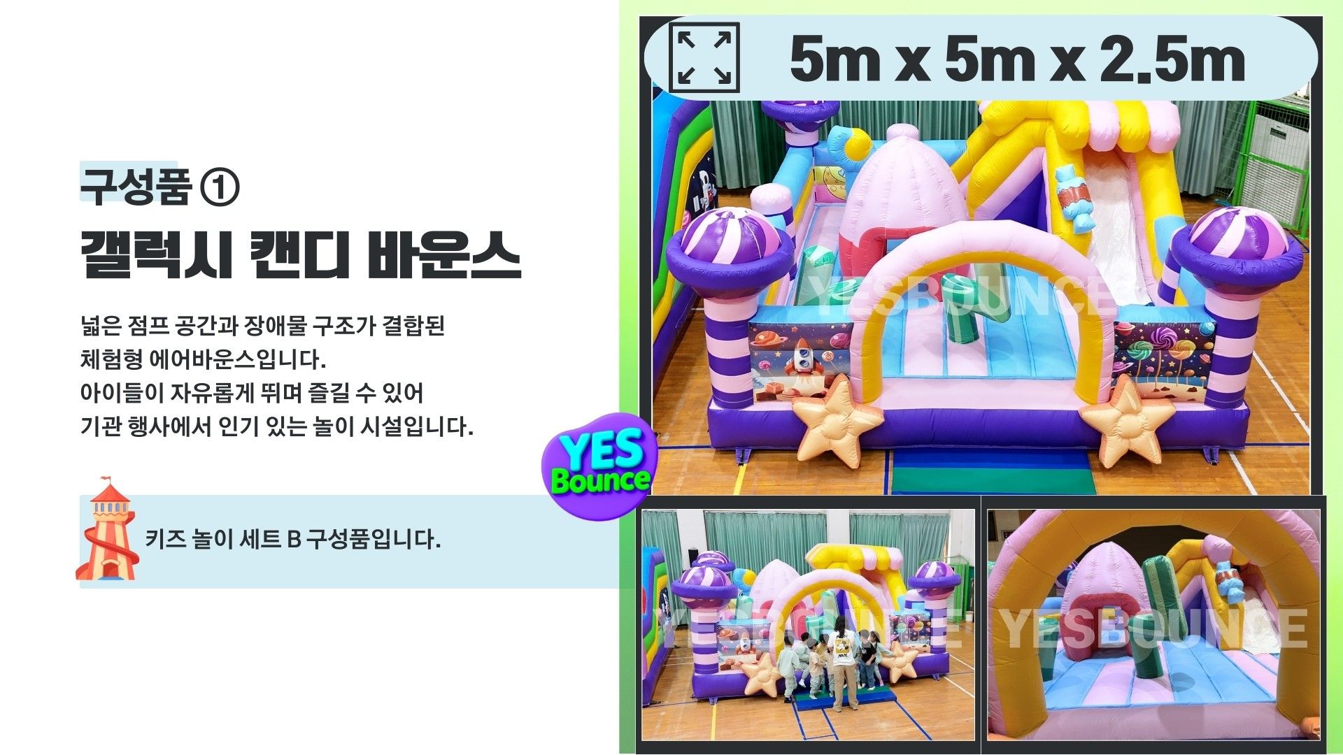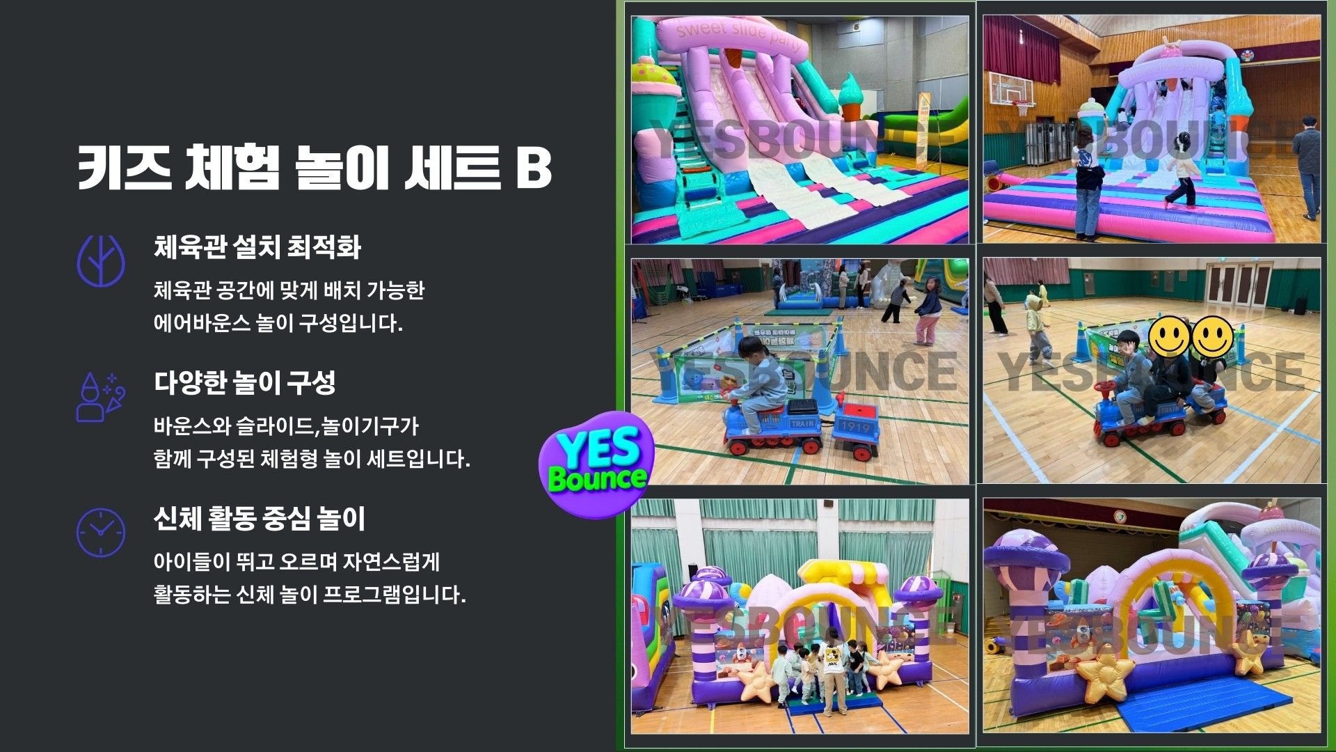 키즈 놀이 세트 B는 갤럭시 캔디 바운스, 스윗 슬라이드, 꼬마기차로 구성된 체험형 놀이 세트입니다. 초등학교 체육관 행사나 유치원 실내 행사에 적합하며 아이들이 뛰고 미끄럼을 즐길 수 있는 인기 에어바운스 놀이 세트입니다.