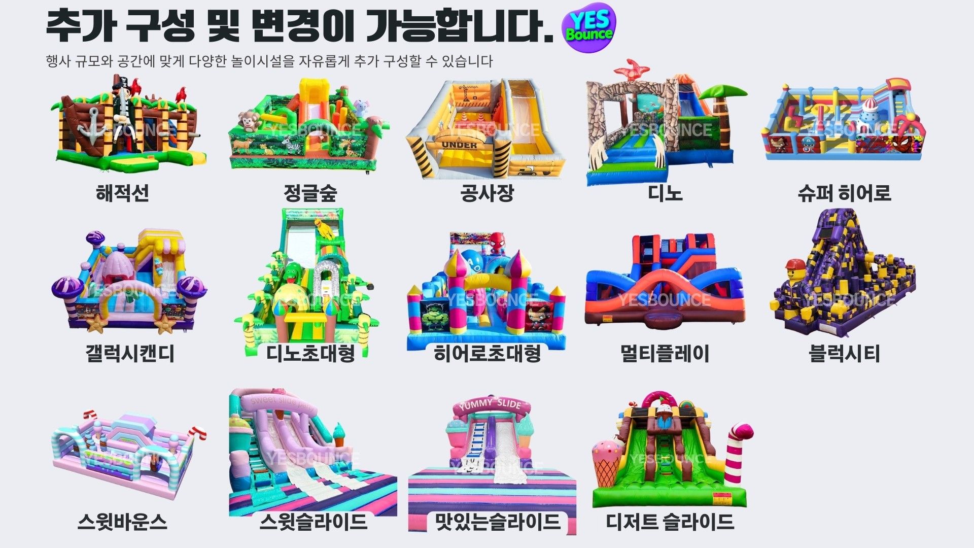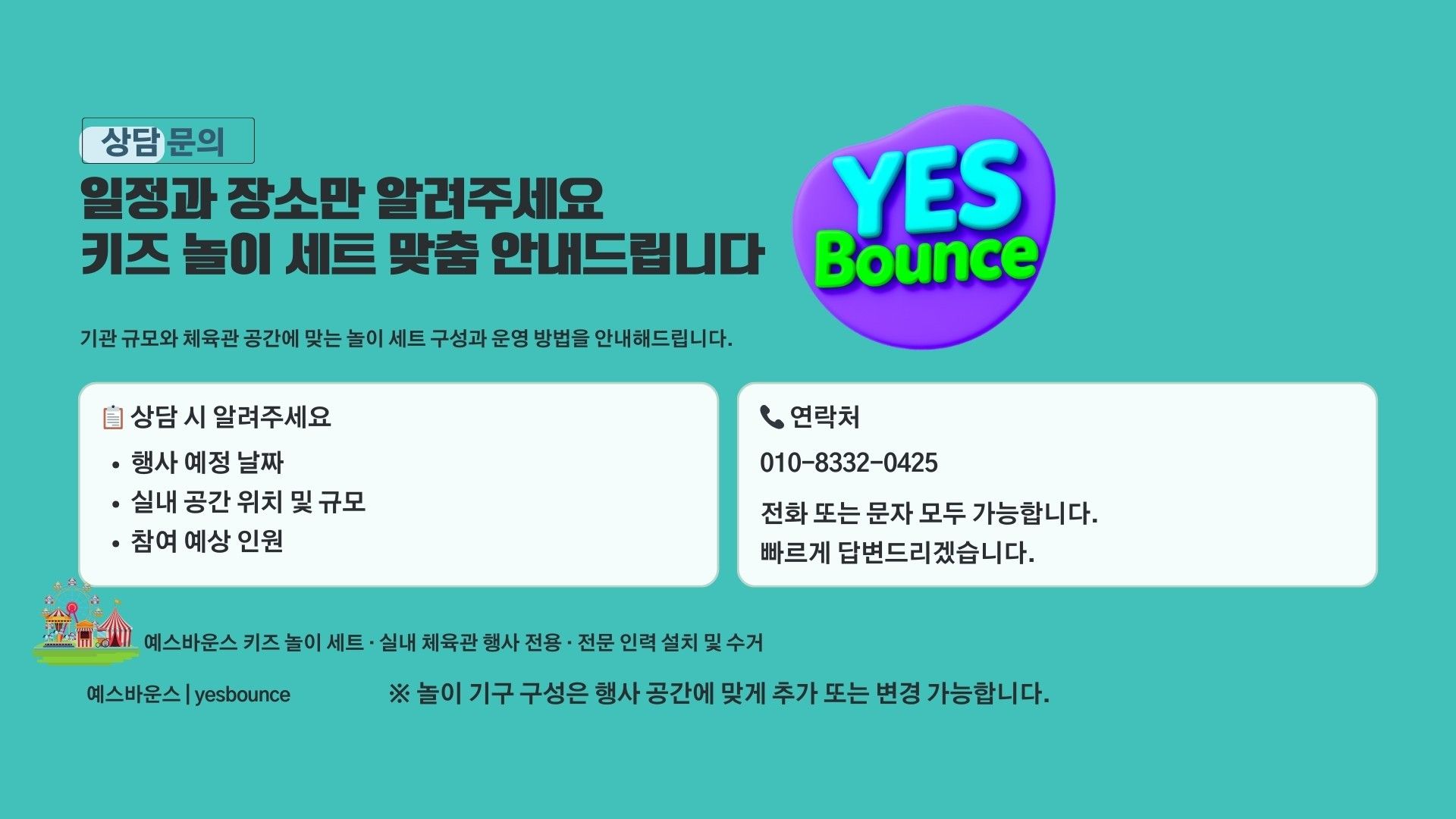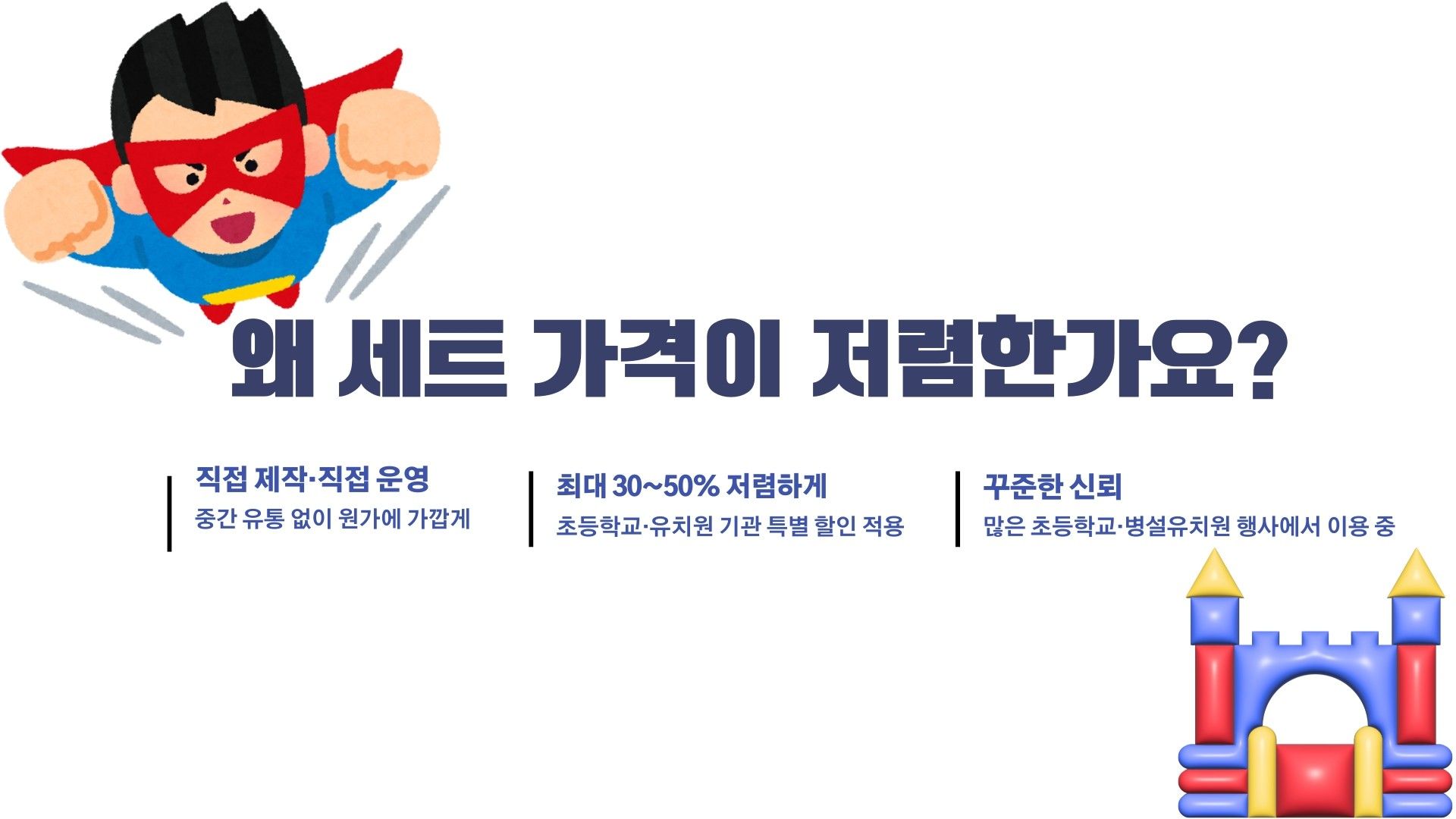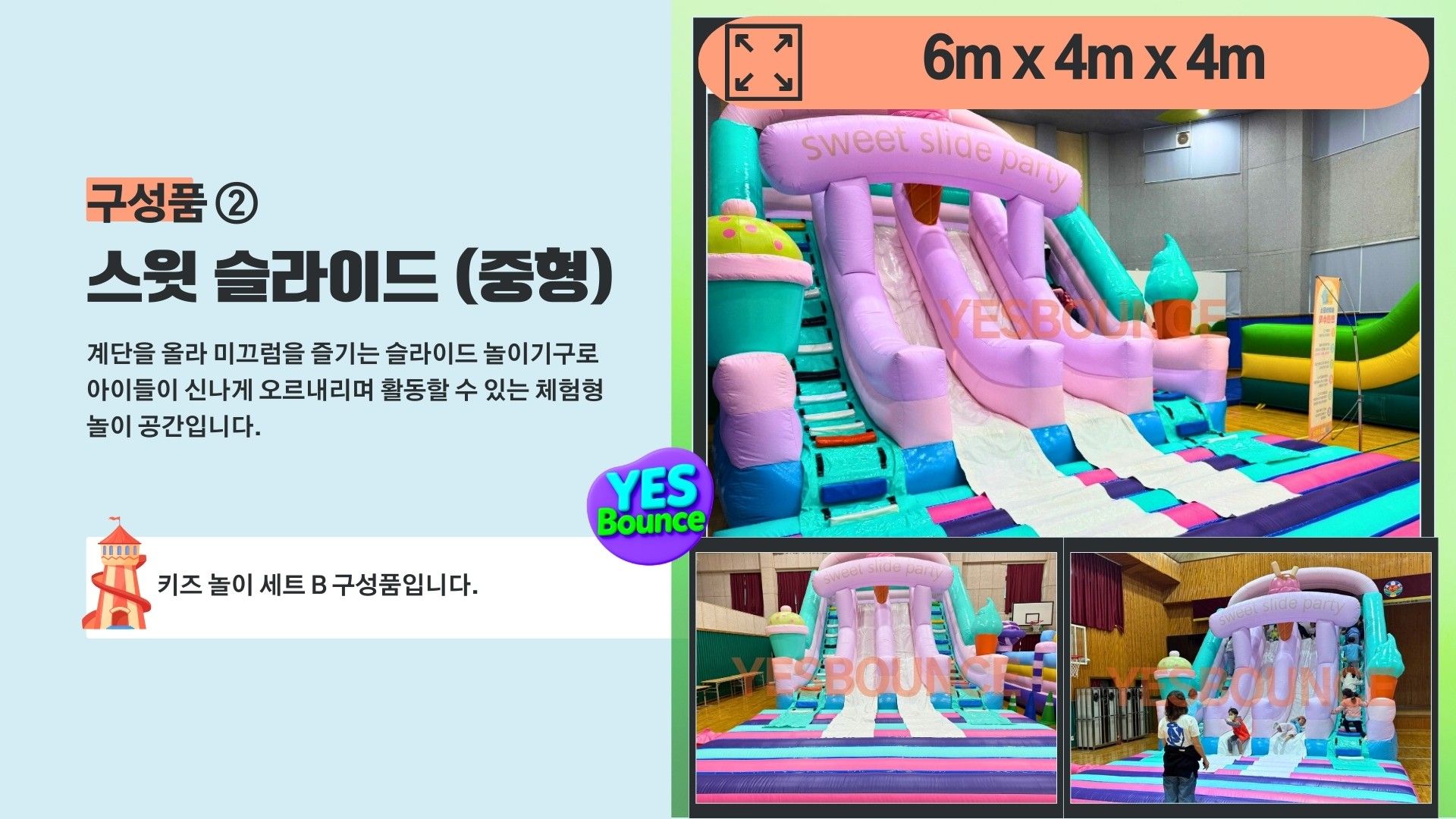 키즈 놀이 세트 B는 갤럭시 캔디 바운스, 스윗 슬라이드, 꼬마기차로 구성된 체험형 놀이 세트입니다. 초등학교 체육관 행사나 유치원 실내 행사에 적합하며 아이들이 뛰고 미끄럼을 즐길 수 있는 인기 에어바운스 놀이 세트입니다.