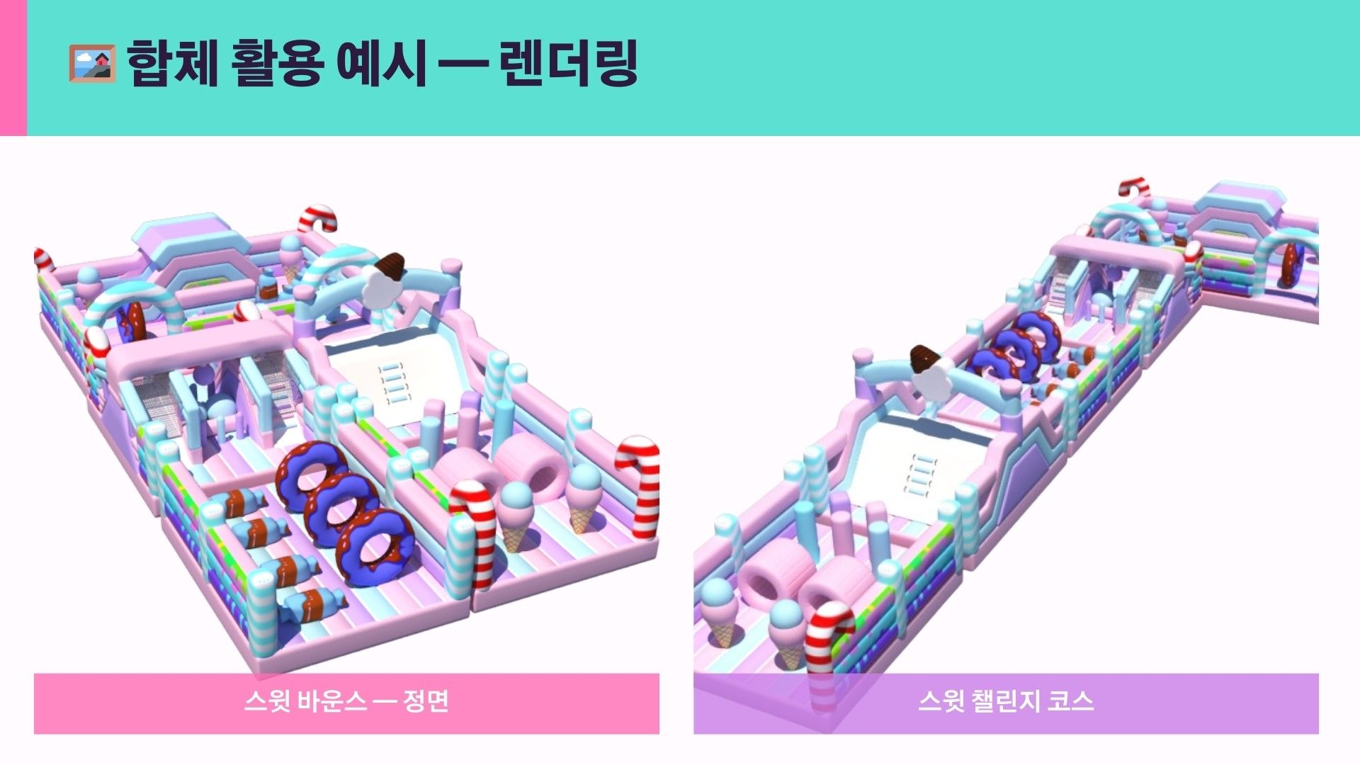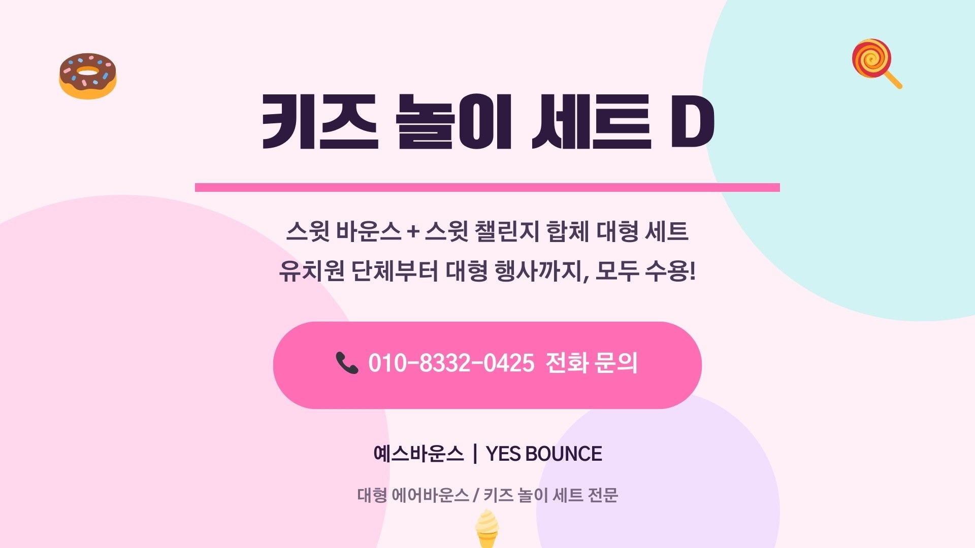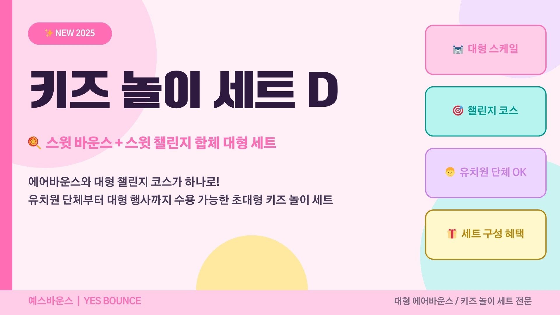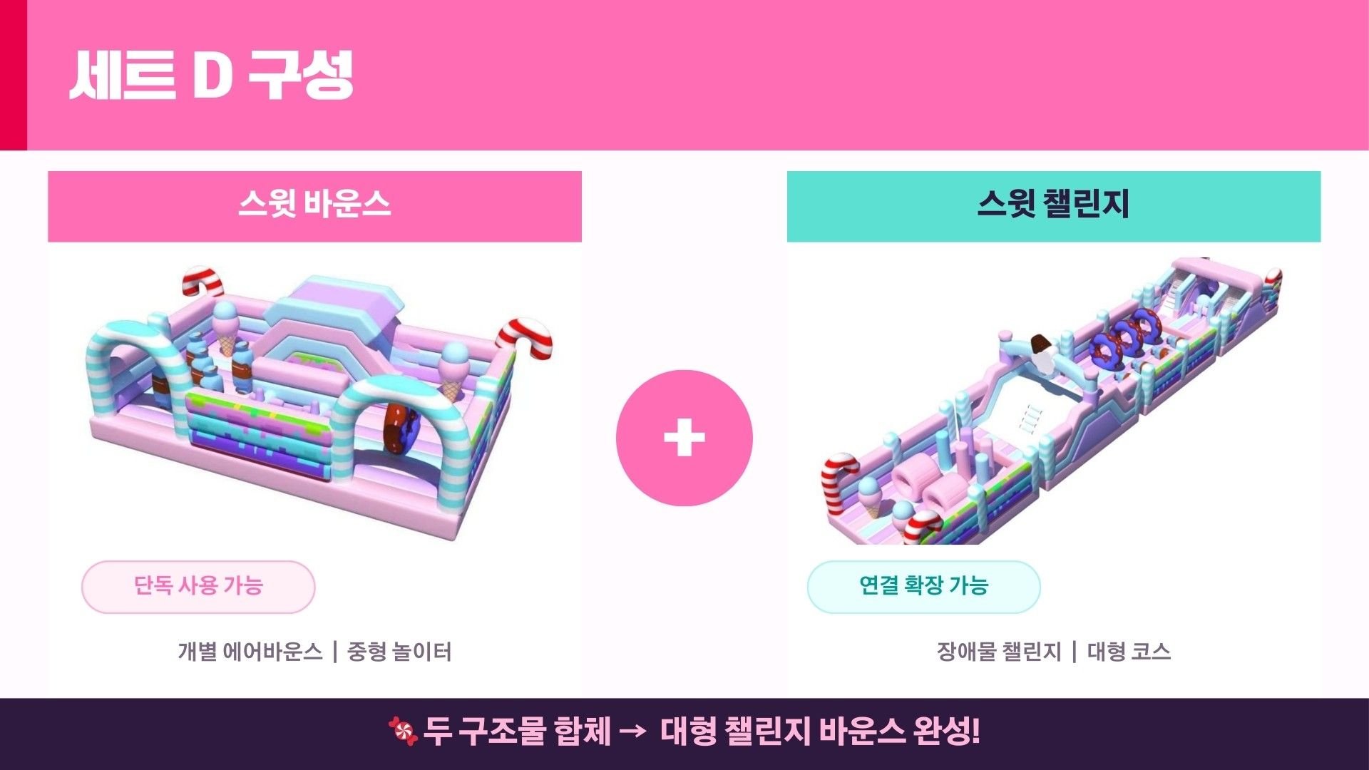 키즈 놀이 세트 D는 스윗 바운스와 스윗 챌린지로 구성된 캔디 테마 체험형 놀이 세트입니다. 두 구조물을 연결하면 대형 챌린지 바운스로 확장되어 유치원 체육관 행사나 실내외 놀이 프로그램에 적합하며, 아이들이 점프부터 장애물 코스까지 신나게 즐길 수 있는 인기 키즈 놀이 구성입니다.