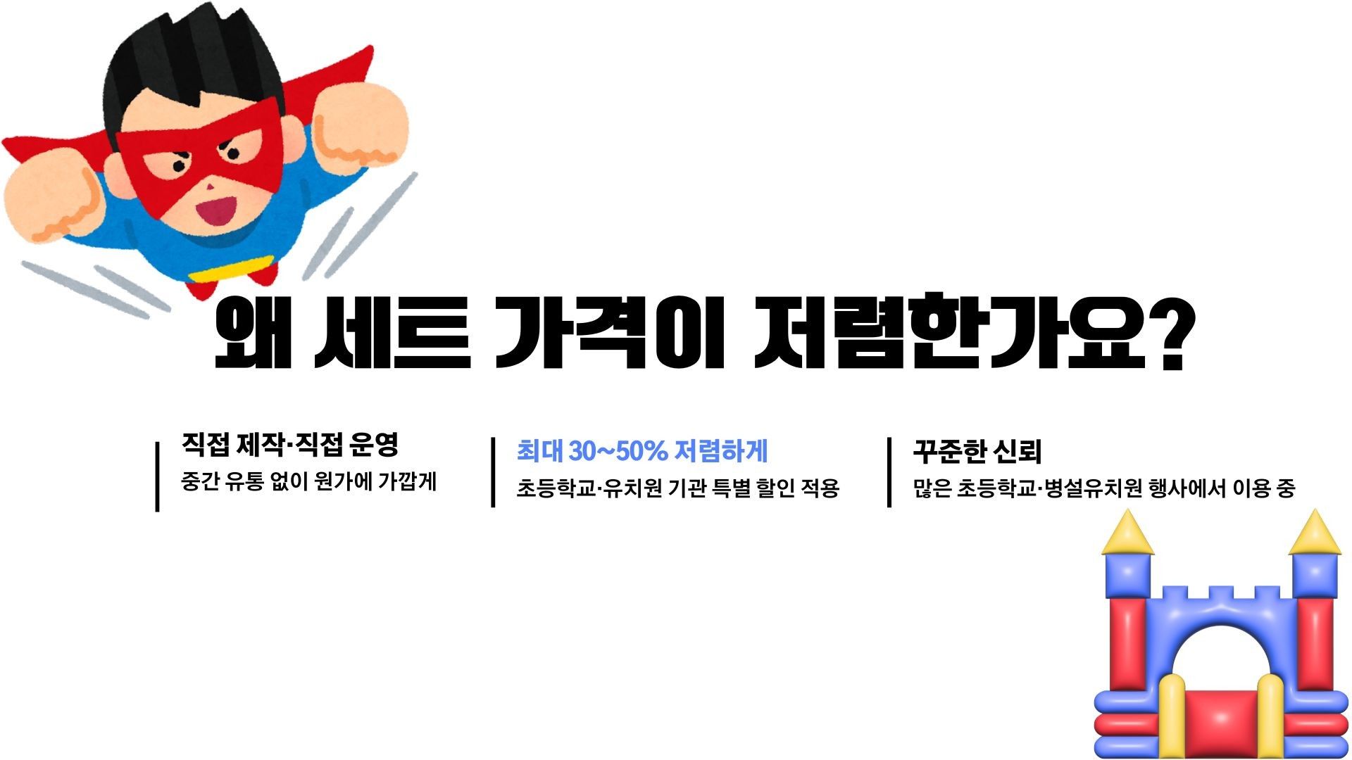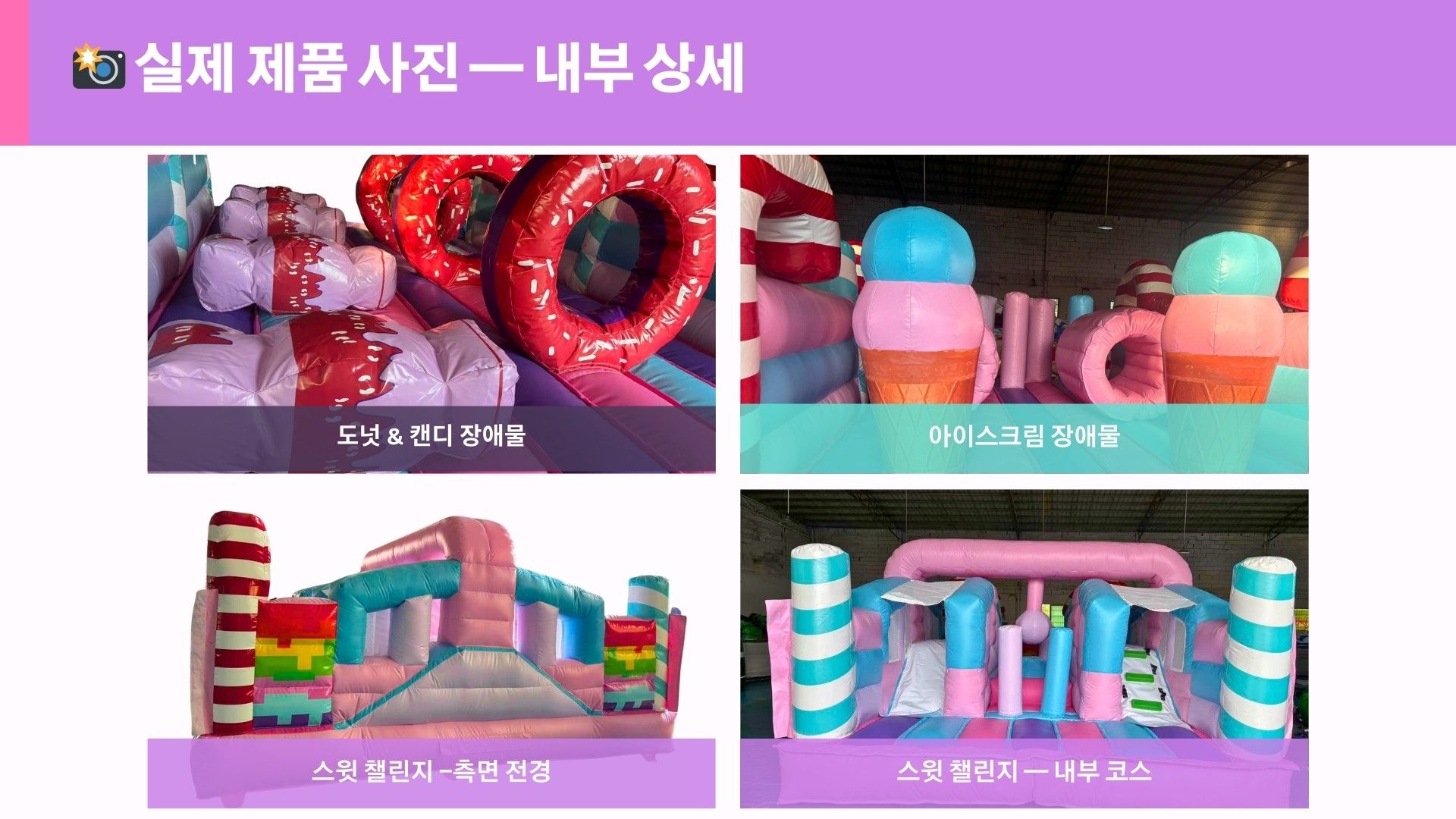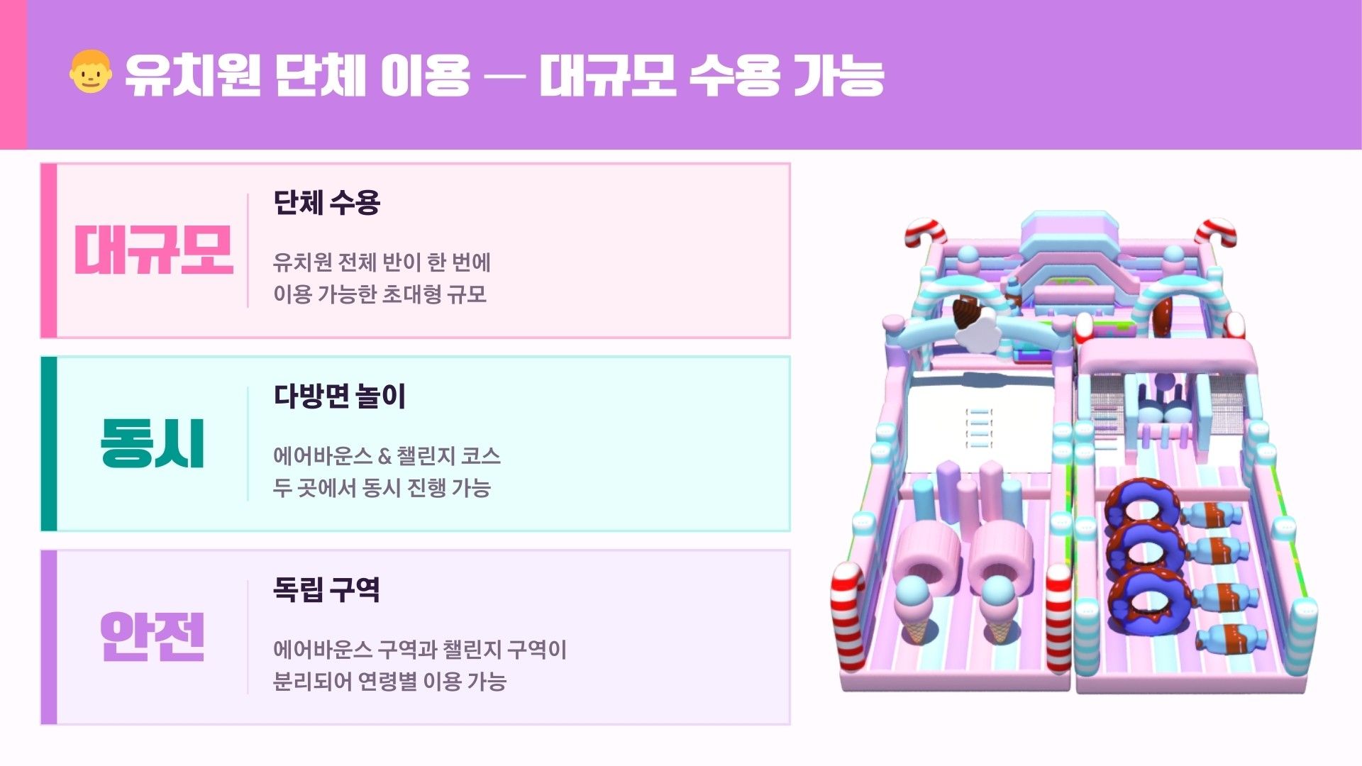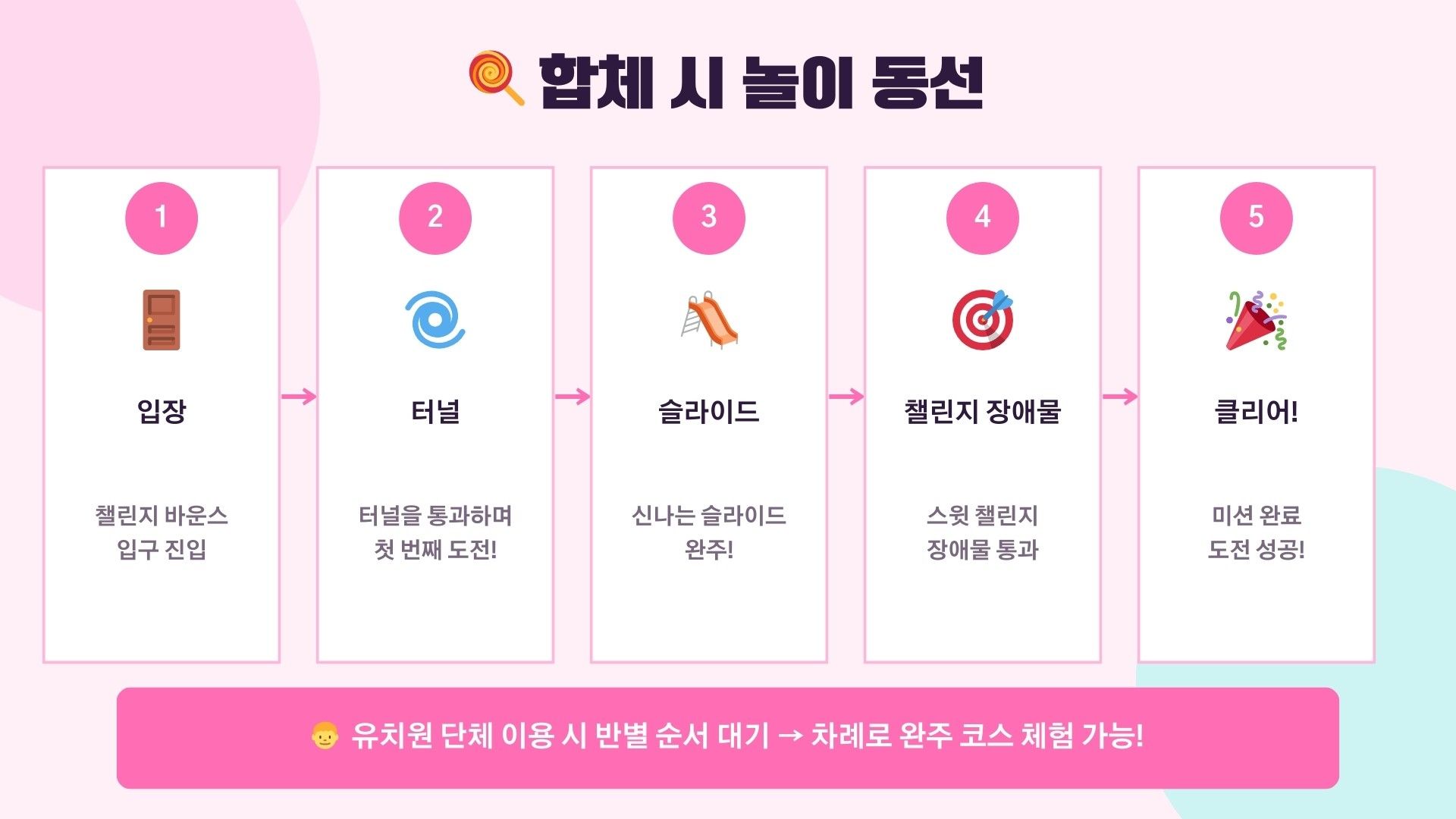 키즈 놀이 세트 D는 스윗 바운스와 스윗 챌린지로 구성된 캔디 테마 체험형 놀이 세트입니다. 두 구조물을 연결하면 대형 챌린지 바운스로 확장되어 유치원 체육관 행사나 실내외 놀이 프로그램에 적합하며, 아이들이 점프부터 장애물 코스까지 신나게 즐길 수 있는 인기 키즈 놀이 구성입니다.