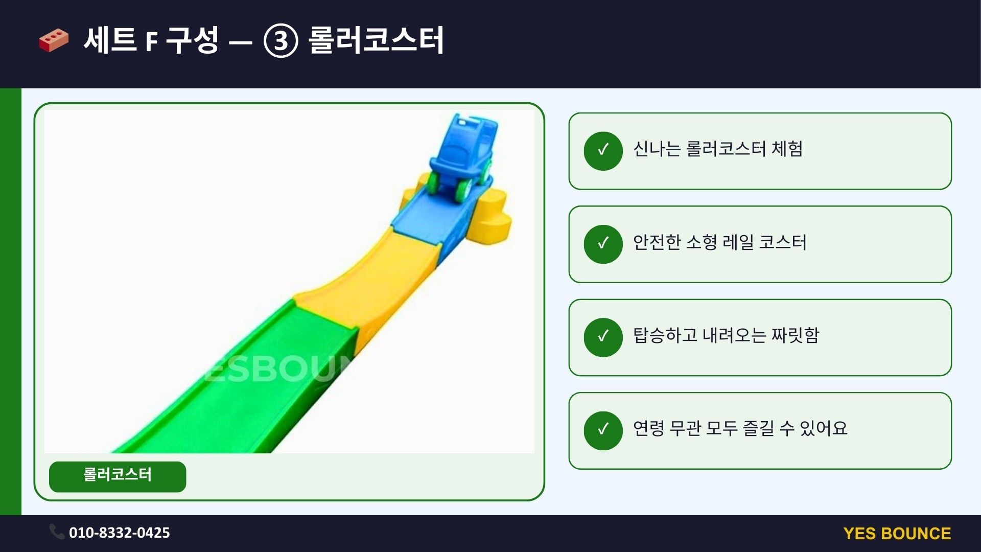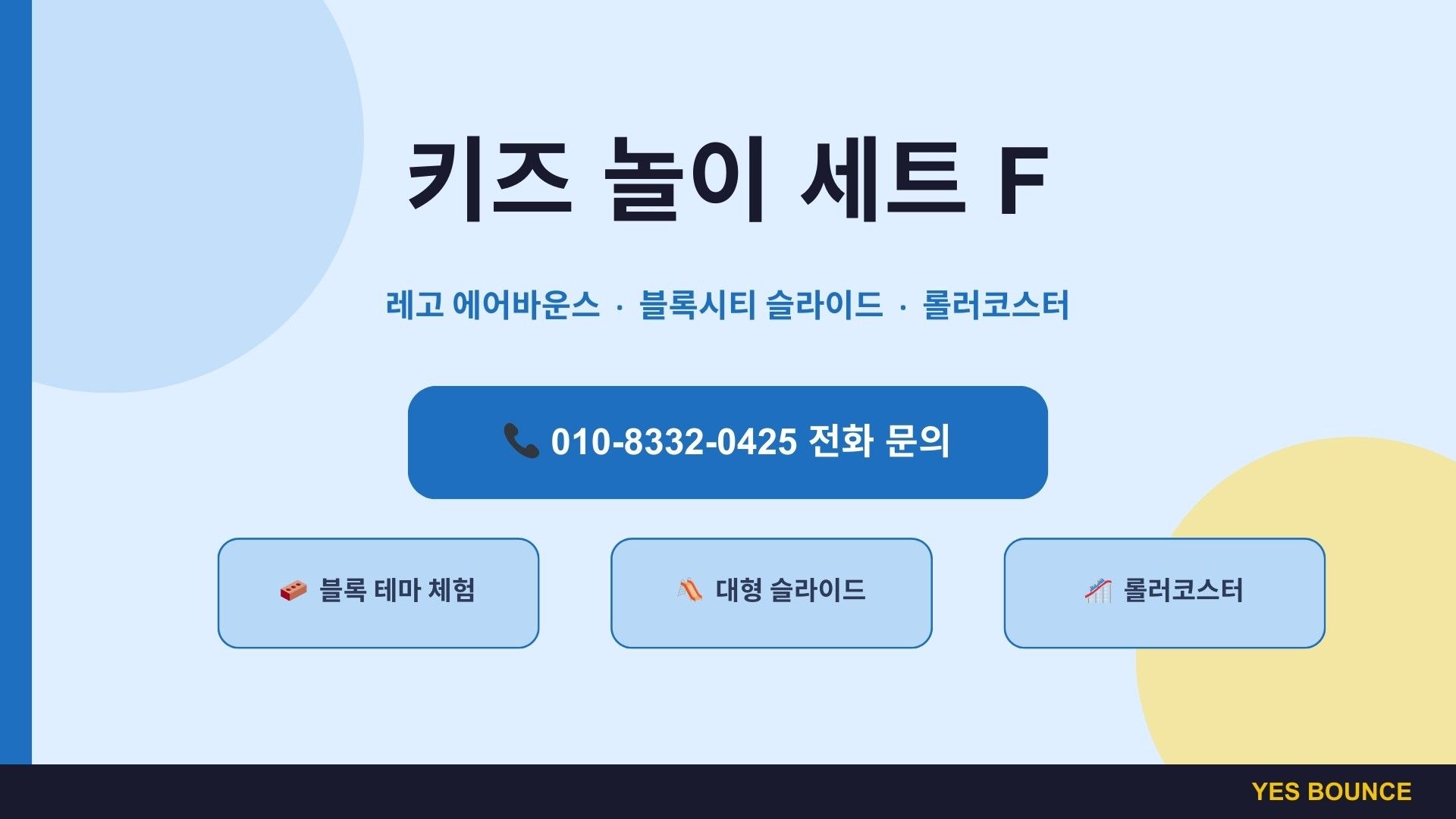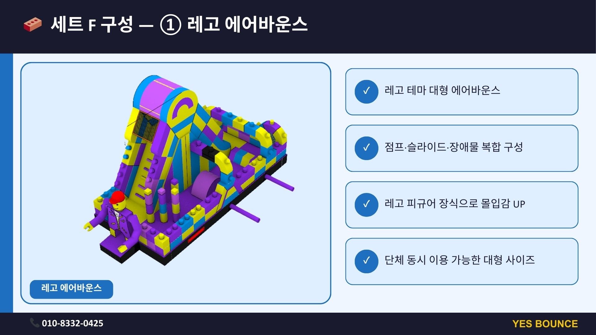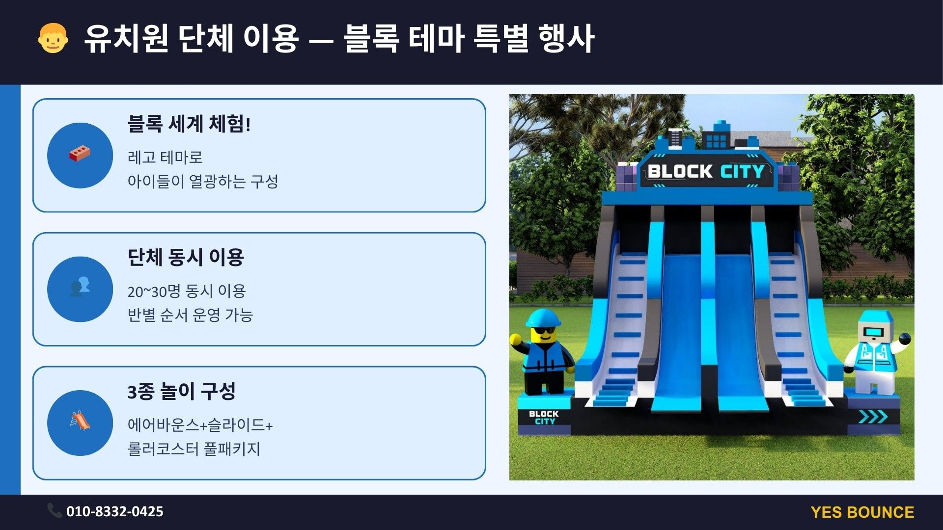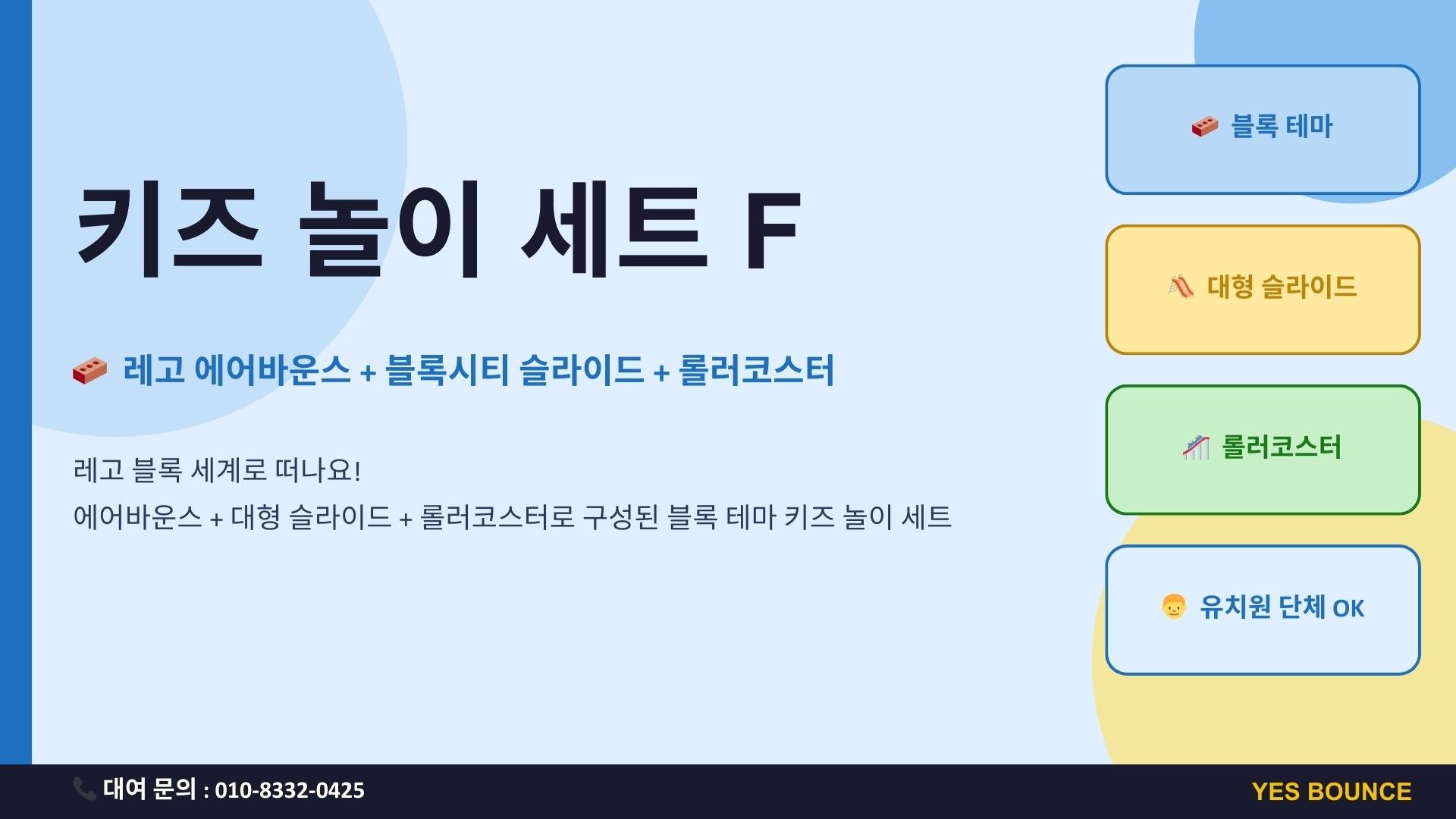 키즈 놀이 세트 F는 레고 에어바운스, 블록시티 슬라이드, 롤러코스터로 구성된 블록 테마 체험형 놀이 세트입니다. 유치원 체육관 행사나 실내 놀이 프로그램에 적합하며 아이들이 점프·슬라이딩·롤러코스터까지 3가지 놀이를 한 번에 즐길 수 있는 인기 키즈 놀이 구성입니다.
